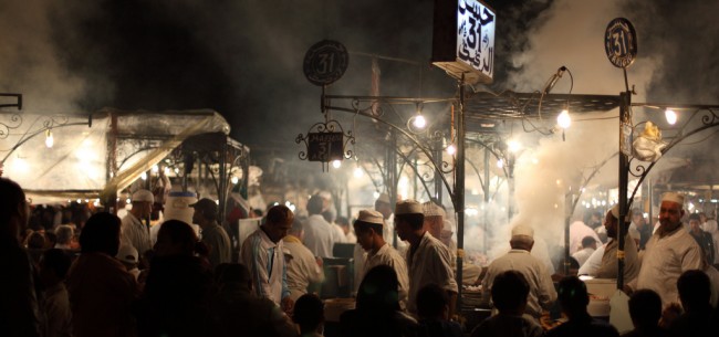 Quảng trường thành phố Jemaa el-Fna luôn náo nhiệt, tấp nập cảnh phố thị kể cả vào buổi tối giống như không khí lễ hội. Nhiều quán ăn, quầy bán thực phẩm phục vụ nhiều món ăn hấp dẫn. Những món ăn phổ biến và giá rẻ, bạn có thể mua với giá rẻ hay ghé vào những khu chợ của Marrakesh.
